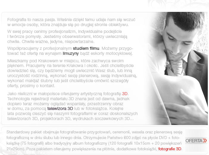 Artystyczna fotografia ślubna Kraków i okolice Krakowa a także Fotografia ślubna 3D Kraków. Mamy dobre ceny, cennik, cena w ofercie... doświadczony fotograf ślubny Kraków na wesele, na prezent, pełen profesjonalizm, tanio jak na Kraków i okolice małopolski, fotografia artystyczna a także grafika! Oferujemy też wideofilmowanie 3d Kraków - jest to bardzo ciekawy sposób na uwiecznianie takich momentów w życiu jak ślub. Polecamy Design Reklama Grafika animacja DTP Kraków także jest w kręgu naszych możliwości. Fotografia ślubna Kraków i wizaż ślubny albo makijaż ślubny Kraków, studio makijażu, makijaż do ślubu. Oferta to: wideofilmowanie, videofilmowanie i znana oraz popularna fotografia ślubna Kraków. Okolice: Skała, Olkusz, Jerzmanowice, Wielka Wieś, Kocmyrzów, Niepołomice, Wieliczka, Dobczyce. Również limuzyny, sale ślubne, filmowanie ślubów Kraków, eskorta motocyklowa, skrzypce, gitara, zespół muzyczny JKM, ArtVito, Fotografia 3d artystyczna ślubna, fotografia ślubna 3d Kraków, fotografia zdjęcia 360 stopni obrotowa Kraków, grafika animacja DTP Kraków, zdjęcia ślubne Kraków, wideofilmowanie 3d Kraków, fotografia ślubna Kraków, zdjęcia 3d Kraków, www.fotografia3d.eu, reklama 3d Kraków, grafik komputerowy Kraków, strony internetowe Kraków 3d, billboard, bilbordy, identyfikacja wizualna firmy, projekty, ulotki, fotograf 3d... i wiele innych, niestety nie mamy jeszcze odpowiedniego forum ślubnego.
